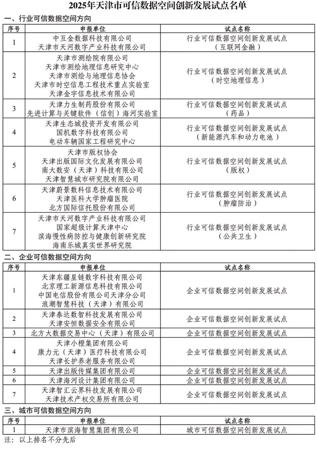 为贯彻落实《可信数据空间发展行动计划(2024—2028年)》(国数资源〔2024〕119号)有关部署,按照《关于征集2025年天津市可信数据空间创新发展试点项目的通知》工作安排,经各企业和行业组织申报、专家评审、名单公示,确定2025年天津市可信数据空间创新发展试点名单,现予公布。